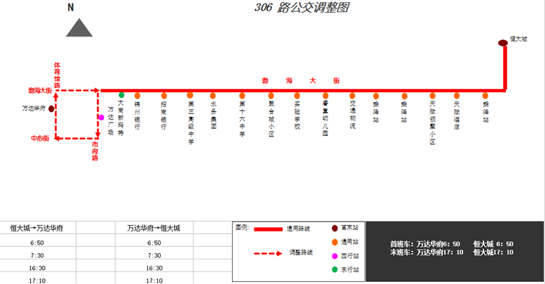調整后:“恒大城”—渤海大街—原線—“錦州銀行”—市府路—“萬達廣場”(西行單向站)—中心街—“萬達華府”。