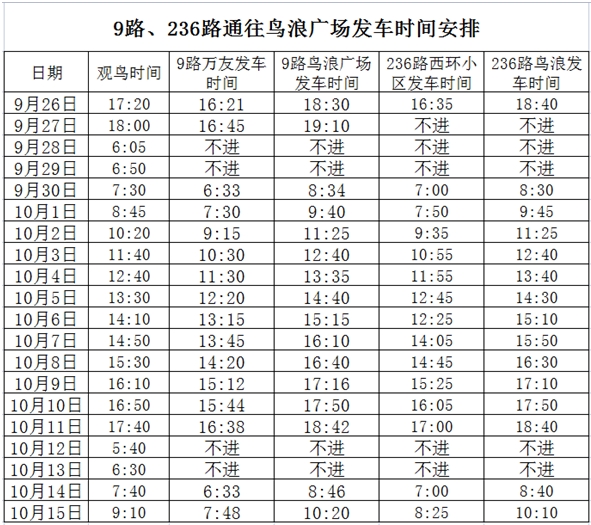 為方便市民“國慶”“中秋”節(jié)日期間觀賞自然景觀時順暢出行,營口交運(yùn)集團(tuán)適時調(diào)整部分公交線路班次。從9月26日起—10月15日,公交9路、236路分時段區(qū)間延伸至大遼河口鳥浪廣場運(yùn)營。
